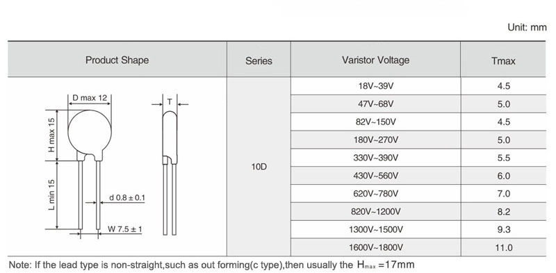 | Part No. | Varistor Voltage | Maximum Allowable Voltage | Maximum Clamping Voltage | Withstanding Surge Current | Rated Wattage | Energy | Typical Capacitance | Datasheet Download | ||