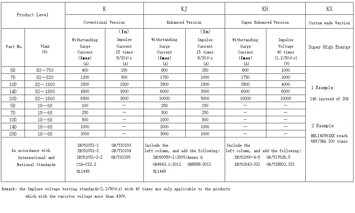 | HEL 10D821K | 820(738~902) | 510 | 670 | 1,355 | 2500 | 1,500 | 0.4 | 85 | 160 | |